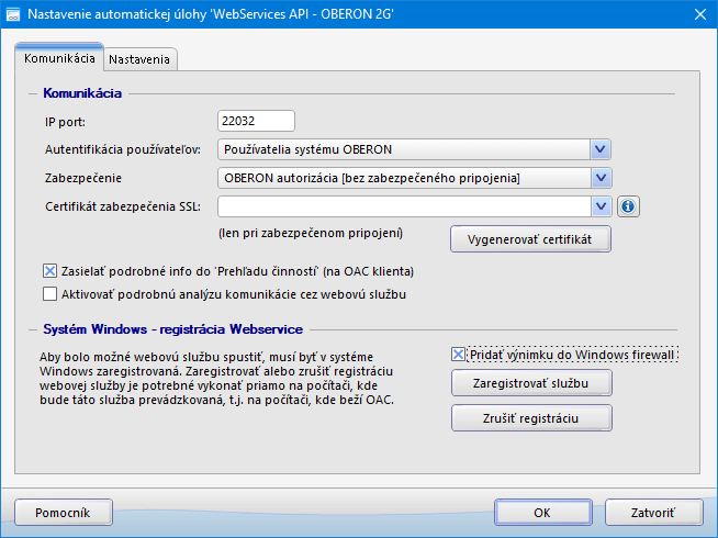 - Stlačte tlačidlo Nastaviť, zobrazí sa formulár Nastavenie automatickej úlohy 'WebServices API - OBERON G2', v ktorom v záložke Komunikácia: