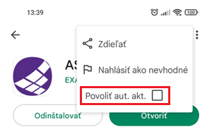 Obrázok č. 3: Zakázanie automatickej aktualizácie aplikácie ASTON v aplikácii Obchod Play (odčiarknutím políčka)