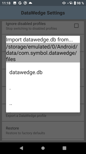 - Otvorí sa ponuka DataWedge Settings. Vyberte možnosť Import Profile. Do mobilného zariadenia stiahnite profil dwprofile_ASTON.db z webovej stránky www.exalogic.sk , sekcia Na stiahnutie, Mobilné riešenia, ASTON – doplnok Zebra TC26s.