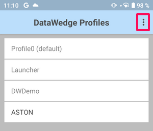 - V ponuke DataWedge Profiles kliknite na ikonu s tromi bodkami a vyberte ponuku Settings: