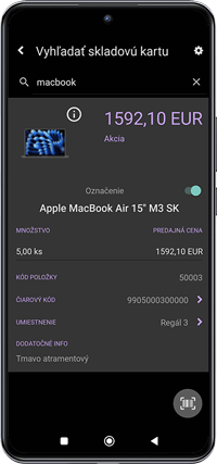- Po vyhľadaní skladovej karty možno v aplikácii prezerať údaje skladovej karty. Po klepnutí na ikonu