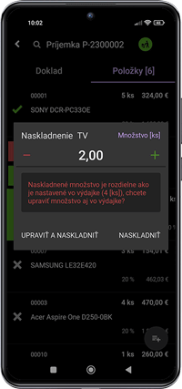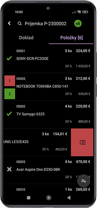 - Na prípadnú úpravu množstva naskladnenej položky potiahnite danú položku prstom doprava. Klepnite na ikonu