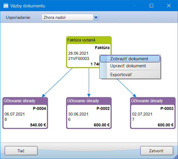 Obrázok č. 1: Väzby dokumentov - zaúčtovaná uhradená faktúra s tromi čiastočnými zaúčtovanými úhradami