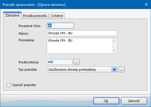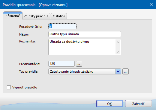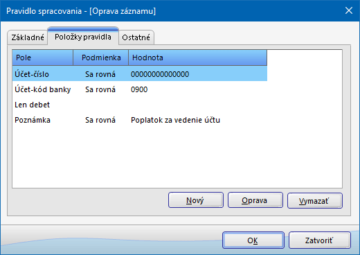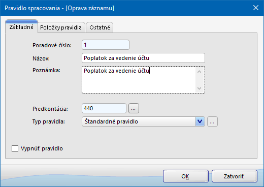 - Štandardné pravidlo - určené na zaúčtovanie bežných položiek bankového výpisu iných ako faktúra, napr. poplatok za vedenie účtu a pod.