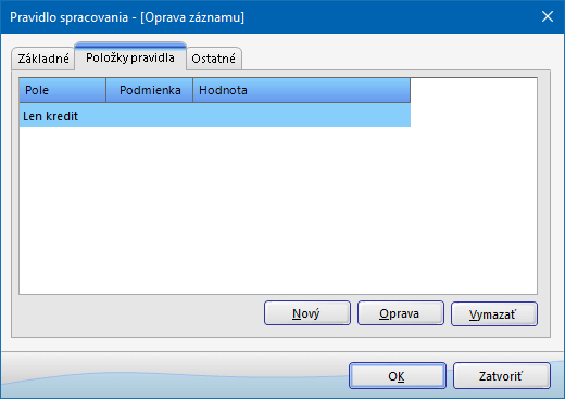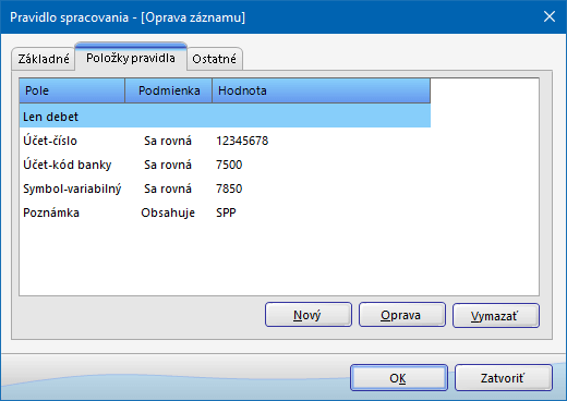 - V záložke Položky pravidla stlačte tlačidlo Nový. V zobrazenom okne Položka pravidla vyberte Pole, Podmienku a Hodnotu podľa charakteru platieb, na ktoré sa bude pravidlo vzťahovať. Rozbaľovací zoznam Pole obsahuje položky Len debet, Len kredit, pri ktorých sa Podmienka a Hodnota nezadávajú. Pri výbere ďalších položiek z rozbaľovacieho zoznamu Pole je potrebné zadať podmienku (sa rovná, obsahuje, začína textom) a hodnotu položky pravidla. Na základe zvolenej podmienky systém porovnáva pole výpisu s hodnotou zadanou v pravidle. Položka výpisu vyhovuje pravidlu, ak sú splnené všetky podmienky, ktoré sú v pravidle definované.