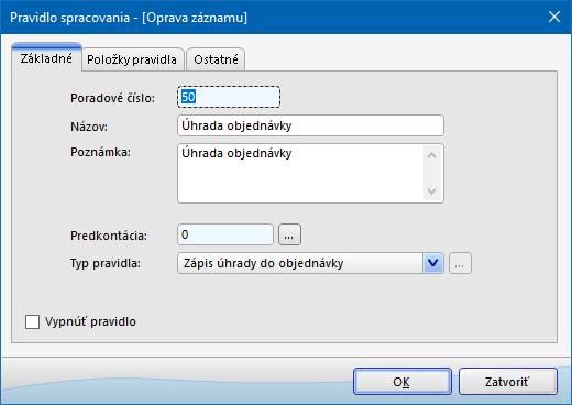 - Ak je v programe definované pravidlo na zápis úhrady prijatej objednávky a ďalšie pravidlo na zaúčtovanie úhrady pohľadávky, je dôležité, ktoré z týchto pravidiel má vyššiu prioritu (nižšie poradové číslo). Pri pravidle s vyššou prioritou je potrebné začiarknuť pole Umožniť použiť aj ďalšie pravidlá spracovania (vo formulári Pravidlo spracovania, záložka základné). Vtedy program pri spracovaní danej položky bankového výpisu bude vyhľadávať vhodné pravidlo aj medzi ďalšími definovanými pravidlami. Pri pravidle s nižšou prioritou je potrebné ponechať pole Umožniť použiť aj ďalšie pravidlá spracovania nezačiarknuté.