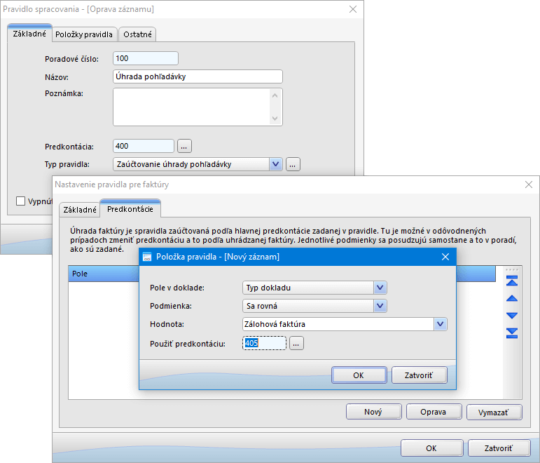 - Zaúčtovanie úhrady pohľadávky - určené na zaúčtovanie úhrady vystavenej faktúry do účtovného/peňažného denníka. Pri tomto type pravidla možno bližšie určiť podmienky na určenie predkontácie, a to na základe cieľového (uhrádzaného) dokladu.