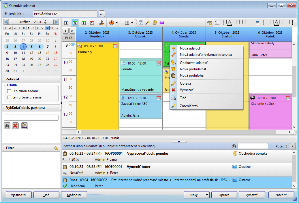 - V systéme OBERON sa z hľadiska evidencie pracuje s úlohami a udalosťami. Pod pojmom úloha sa rozumie každá činnosť, ktorá je pridelená konkrétnej osobe na vykonanie. Ide vlastne o súbor informácií, ktorý obsahuje názov a popis úlohy, dátum začiatku a konca úlohy, dátum požadovaného konca úlohy, typ úlohy, stav úlohy (plánovaná, prebieha, ukončená, zamietnutá, zrušená...), prípadne ďalšie informácie. Ku každej úlohe možno evidovať stupeň dokončenia úlohy vyjadrený v %. Úloha sa nezobrazuje v Kalendári udalostí. Príkladom úlohy je vypracovanie cenovej ponuky, výmena žiarovky v izbe, potreba odoslať balík atď. Pod pojmom udalosť sa rozumie každá aktivita v záujme efektívneho riadenia procesov vo firme (stretnutie, porada, školenie, prijatý telefonát, e-mailová komunikácia), ktorá môže mať rôzny stav (plánovaná, vykonaná, nevykonaná, zrušená). Udalosti sa môžu a nemusia zobrazovať v Kalendári udalostí alebo môžu byť označené ako súkromné; vtedy sú dostupné len používateľovi, ktorý danú udalosť vytvoril, prípadne používateľom, pre ktorých sú určené. Udalosť má na rozdiel od úlohy svoj začiatok a koniec. Viac informácií získate v téme Úlohy a udalosti.