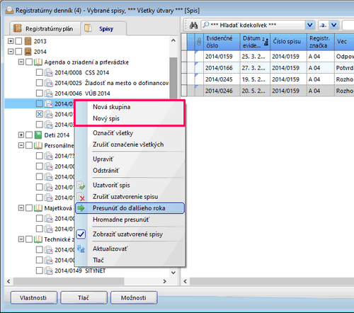 Obrázok č. 1: Vytváranie nových skupín a spisov v Registratúrnom (podacom)denníku