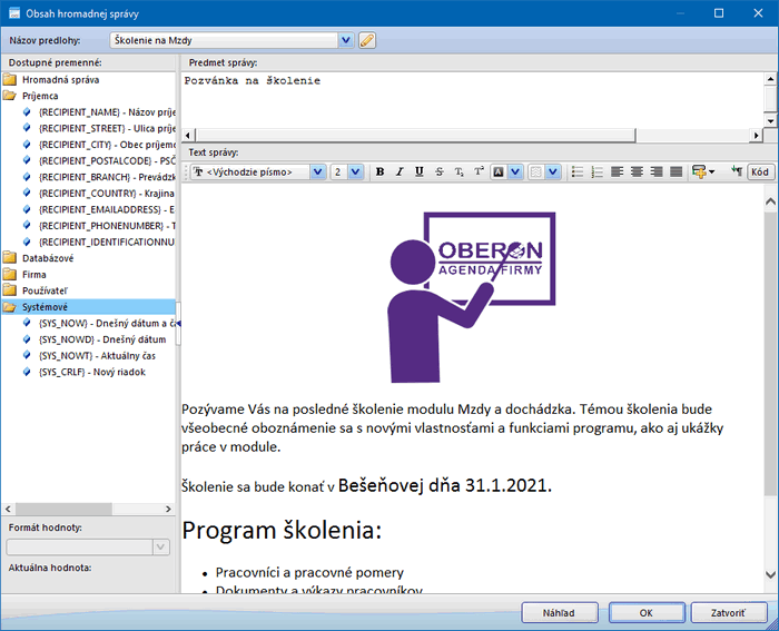 - Hromadné e-mailové správy sa vytvárajú v programe OBERON – Agenda firmy v ponuke CRM, Hromadné správy (kampane).