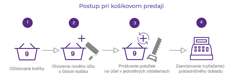 - Košíkový predaj umožňuje v ktoromkoľvek oddelení predajne na počítači bez fiškálnej tlačiarne otvoriť zákazníkovi účet a priradiť mu konkrétne číslo košíka. Následne možno na takýto účet postupne pridávať tovar v jednotlivých oddeleniach predajne. V prípade digitálnych váh sa údaje o odváženom tovare odosielajú na otvorený účet automaticky. Na registračnej pokladnici (hlavnom počítači s fiškálnym zariadením) napokon obsluha pred zaplatením skontroluje správnosť položiek pridaných na otvorený účet a účet uzavrie zaevidovaním (vytlačením) pokladničného dokladu.