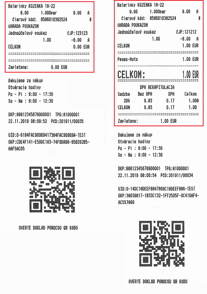 Obrázok č. 3: Pokladničný doklad pri výmene jednoúčelového poukazu s rovnakou hodnotou tovaru (vľavo) a vyššou hodnotou tovaru (vpravo)