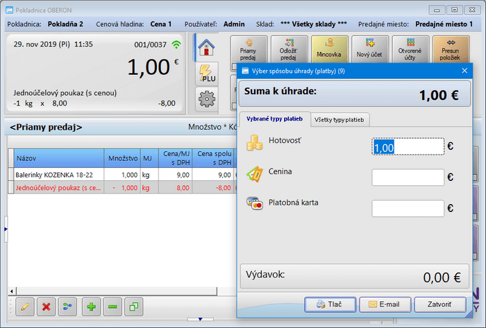 - Pri štandardnej výmene jednúčelového poukazu (s rovnakou hodnotou ako tovar) sa na Pokladnici OBERON nevyberá žiadny spôsob úhrady. Pri vyššej hodnote služby alebo tovaru je potrebné zvoliť niektorý zo spôsobov úhrady.