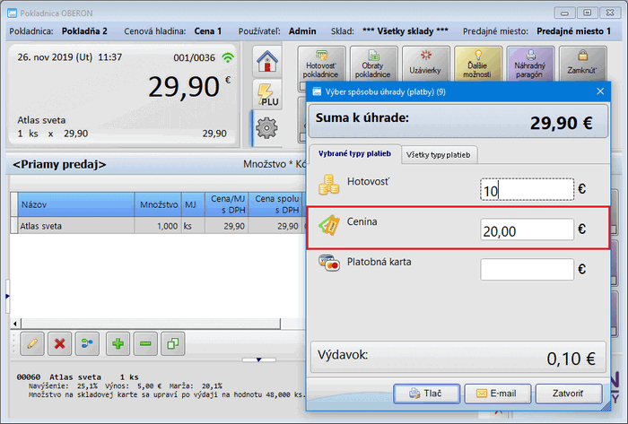 - Na druhej strane, pri výmene viacúčelového poukazu za tovar/službu je predávajúci povinný túto tržbu vo forme poukážky zaevidovať v pokladnici - z Pokladnice OBERON tak zákazník dostane pokladničný doklad, pričom pri platbe je potrebné vybrať spôsob úhrady Cenina.