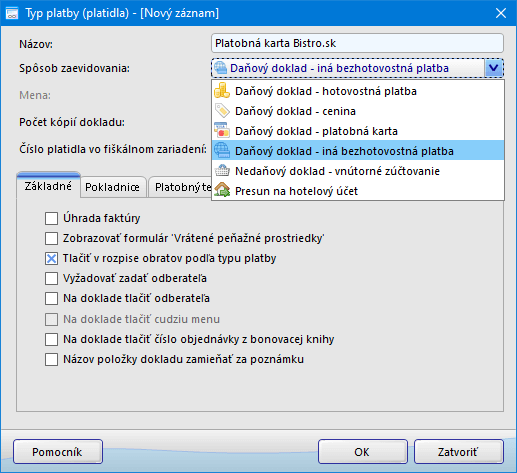 Obrázok č. 1: Typ platby so spôsobom zaevidovania Daňový doklad - iná bezhotovostná platba