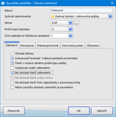 - Daňový doklad - hotovostná platba - používa sa pre všetky hotovostné operácie, je to najčastejšie používaný typ platby. Navyšuje denné obraty a zostatok hotovosti v pokladnici. Ak chcete na pokladnici prijímať aj cudzie meny v hotovosti, vytvorte pomocou tejto voľby príslušný počet typov platby podľa prijímaných mien.