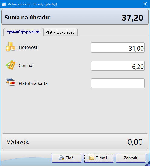 Stlačením tlačidla F12 - Tlač dokladu sa otvorí formulár Výber spôsobu úhrady (platby) (Obrázok č. 2). Obsluha zvolí spôsob úhrady, zadá hodnotu prijatých peňažných prostriedkov (prípadne stravných lístkov alebo aj iných cenín, resp. platobnej karty) a následne sa vytlačí pokladničný doklad. Hodnota výdavku sa zobrazí aj na displeji Pokladnice OBERON.