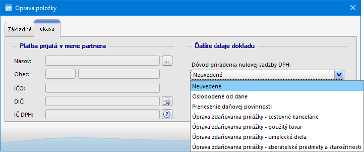 Ďalšie údaje dokladu - z rozbaľovacieho zoznamu je možné vybrať dôvod osobitnej úpravy zdaňovania. Dôvod priradenia nulovej sadzby DPH môže byť: