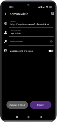 - Príslušné nastavenia v jednotlivých aplikáciách - po nastavení služby OBERON Link je potrebné vykonať súvisiace nastavenia v jednotlivých aplikáciách, ktoré so systémom OBERON komunikujú pomocou webových služieb (napr. ASTON - pozri Obrázok č. 1). Na jednoduché nastavenie parametrov komunikácie v mobilných aplikáciách ASTON a LUKUL možno vygenerovať QR kód (vo formulári Nastavenie automatickej úlohy 'WebServices API - OBERON', záložka Nastavenia, tlačidlo Vygenerovať QR kód).