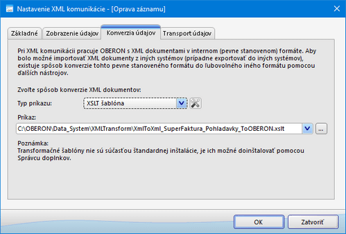- V prípade inštalácie transformačnej šablóny na import/export dokladov zo Správcu doplnkov sa v ponuke Servis, Nastavenia XML komunikácie automaticky vytvorí príslušné nastavenie (napr. Import vydanej FA do pohľadávok - SuperFaktura->OBERON, Export vydanej FA do formátu Editel XML - OBERON->EDITEL a pod.) s nastaveným spôsobom konverzie a vybratou príslušnou transformačnou šablónou. Manuálne nastaviť je v ňom však potrebné ďalšie parametre v prípade, že sa položky dokladu majú naimportovať/vyexportovať ako skladové (sklad, polia na synchronizáciu skladových položiek atď.). V opačnom prípade sa položky dokladu naimportujú/vyexportujú ako neskladové.