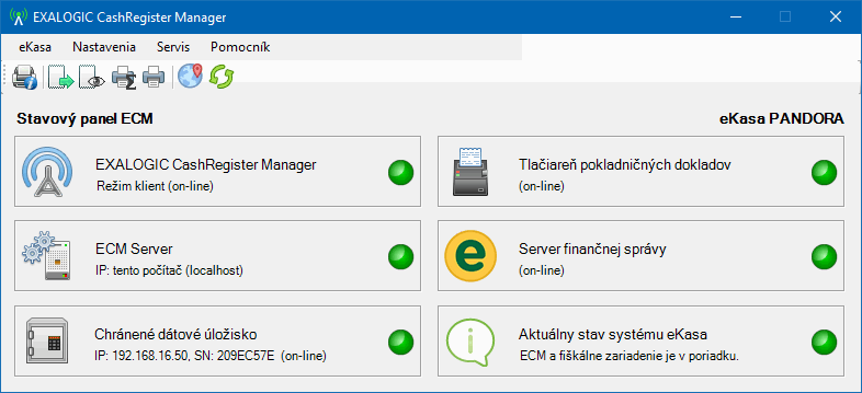 - EXALOGIC CashRegister Manager - aktuálny stav ovládača ECM z hľadiska jeho pripojenia na ECM Server.