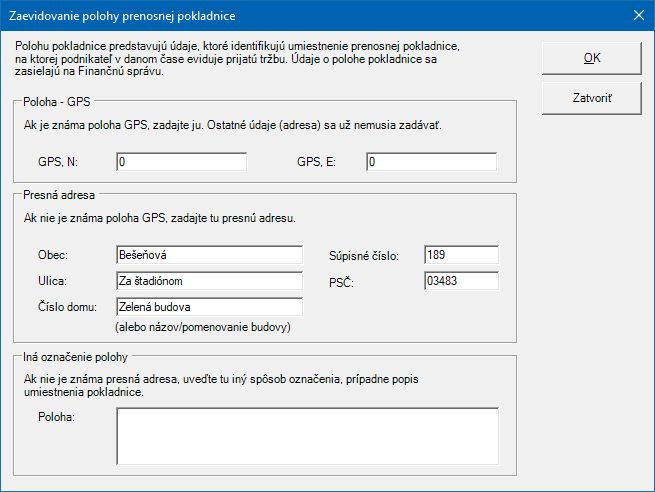 - ak nie je známa presná adresa, uveďte iný spôsob označenia, prípadne umiestnenia pokladnice.