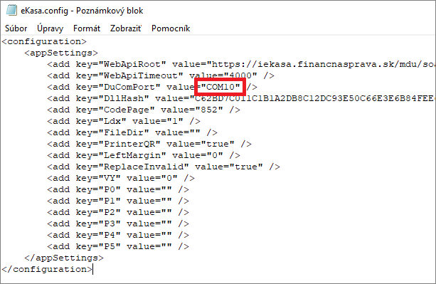 Obrázok č. 3: Manuálna úprava čísla komunikačného portu v konfiguračnom súbore Ovládača pre fiškálny modul Easy-Pos.eKasa