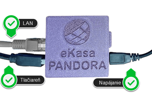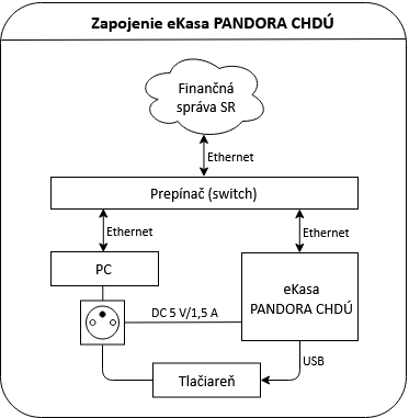 - Zariadenie eKasa PANDORA CHDÚ sa do počítačovej siete pripája pomocou ethernet kábla, a to prostredníctvom prepínača (switchu), do ktorého je obdobným spôsobom pripojený aj počítač. Do elektrickej siete sa zapája pomocou sieťového adaptéra (DC 5 V/1,5 A) s Micro USB konektorom, ktorý je súčasťou balenia.