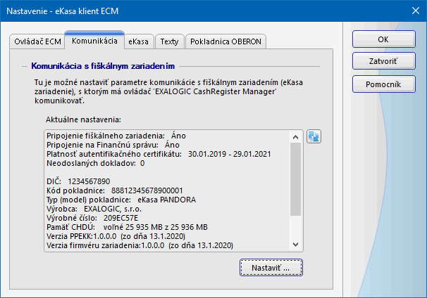 - Po nastavení ovládača ECM pokračujte nastaveniami v záložke Komunikácia. Po stlačení tlačidla Nastaviť sa otvorí sprievodca, v ktorom sa nastavujú parametre komunikácie medzi ovládačom ECM a samotným zariadením eKasa PANDORA CHDÚ. Postup nastavenia parametrov komunikácie je popísaný v téme Sprievodca - Nastavenie komunikácie fiškálneho zariadenia.