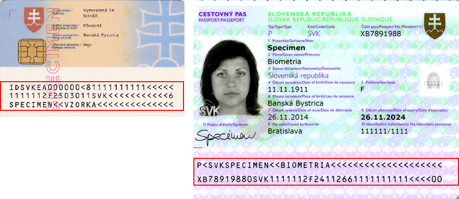 Obrázok č. 1: Strojovo čitateľná zóna (MRZ) na občianskom preukaze a pase