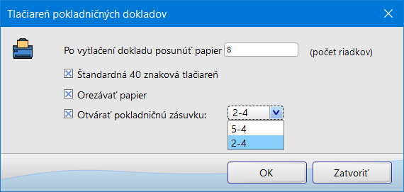 - či je v zozname zariadení pridaná tlačiareň pokladničných dokladov a v nastaveniach začiarknutá možnosť Otvárať pokladničnú zásuvku, prípadne správne vybraný pin (vývod) na otváranie zásuvky (Obrázok č. 2),