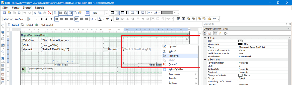 - U tých používateľov, ktorí si upravili tlačové výstupy v starších verziách OBERON-u (do verzie Júl/2023), je potrebné, aby si do upraveného tlačového výstupu manuálne skopírovali pole na digitálny podpis z originálneho tlačového výstupu (pozri Obrázok č. 2). V tlačových výstupoch upravených vo verzii Júl/2023 a novších to nie je potrebné.