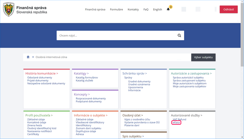 - Na portáli Finančnej správy SR sa prihláste do svojej Osobnej internetovej zóny (OIZ), zvoľte sekciu eKasa (Obrázok č. 1).