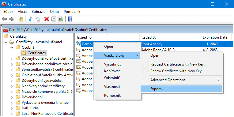 - V otvorenej kontextovej ponuke zvoľte možnosť Všetky úlohy, Export... (Obrázok č. 1). Otvorí sa Sprievodca exportom certifikátov, v ktorom:
