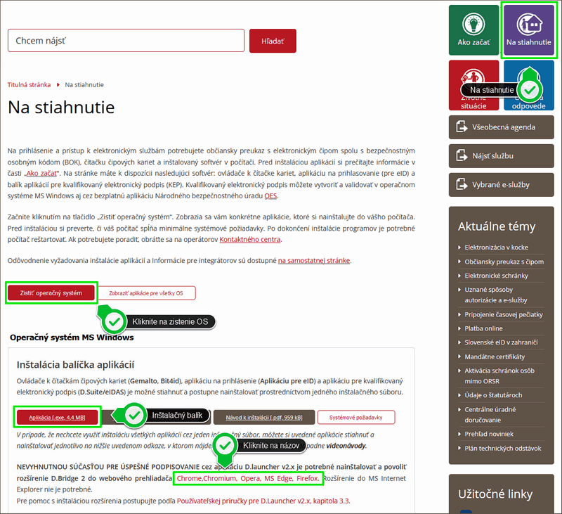 - Zistenie operačného systému pred inštaláciou - vo webovom prehliadači zadajte adresu www.slovensko.sk a stlačte tlačidlo Na stiahnutie. V otvorenej sekcii stlačte tlačidlo Zistiť operačný systém na zistenie operačného systému počítača, do ktorého budete balík aplikácií inštalovať.