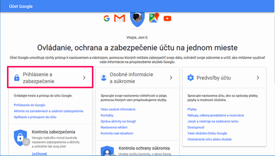 2. Zobrazí sa váš účet. Stlačte ponuku Prihlásenie a zabezpečenie.