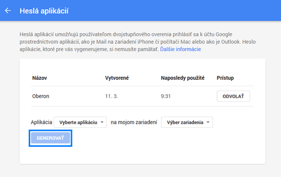 4. Heslo je možné vygenerovať v časti Heslá aplikácií po prihlásení do svojho účtu. V časti Heslá aplikácií vyberte aplikáciu Iné (vlastný názov) a stlačte tlačidlo Generovať. Vygeneruje sa kód, heslo pre SMTP server, ktorý je potrebné zadať do OBERON-u.