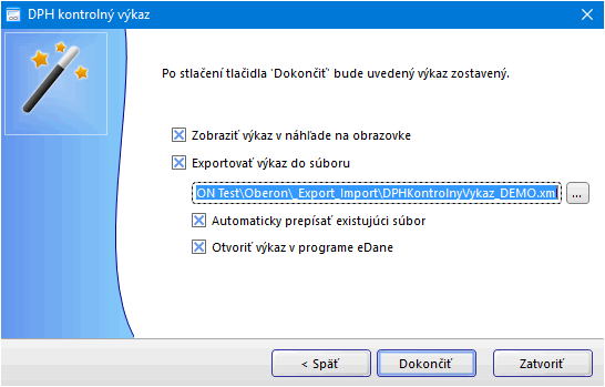 - V poslednom kroku sprievodcu zvoľte možnosť Exportovať výkaz do súboru, pričom venujte zvýšenú pozornosť ceste k súboru (prednastavený adresár je C:\OBERON\_Export_Import\).
