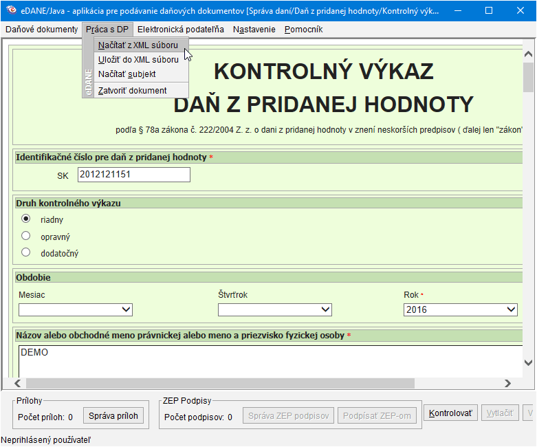 - V ponuke Práca s DP zvoľte možnosť Načítať z XML súboru.