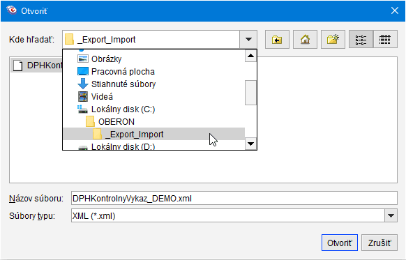 - Nalistujte exportovaný dokument XML a potvrďte tlačidlom Potvrdiť. Systém OBERON má na ukladanie súborov predvolený adresár C:\OBERON\_Export_Import a presná cesta aj s názvom súboru je uvedená v sprievodcovi tvorbou výkazu (Obrázok č. 1).