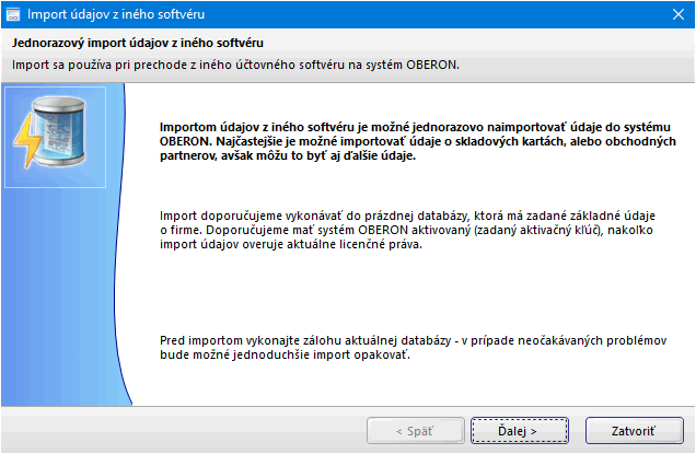 - Import odporúčame vykonávať do prázdnej databázy, ktorá má zadané základné údaje o firme. Samotný OBERON odporúčame mať aktivovaný, resp. mať objednanú licenciu a využiť jej dočasnú platnosť, t. j. trial licenciu), keďže import údajov overuje aktuálne licenčné práva. Import je však možné použiť aj na import údajov do už používanej databázy. V tom prípade pred importom vykonajte zálohu databázy.
