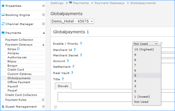 Poznámka: Ak budete používať viac ako jednu platobnú bránu (napr. Globalpayments a zároveň PayPal), číslo určí poradie, v ktorom sa na stránke rezervácie zobrazí možnosť platby prostredníctvom danej platobnej brány. Ak budete používať len jednu platobnú bránu, je možné na aktiváciu použiť ľubovoľné číslo.