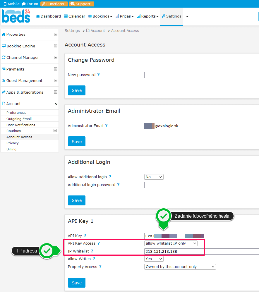 - propKey - v ponuke Properties, zvoľte položku Access - v sekcii API Access do poľa propKey zadajte ľubovoľný prístupový kľúč (akoby heslo, avšak iné ako API Key 1). PropKey v Beds24 musí byť zadaný.
