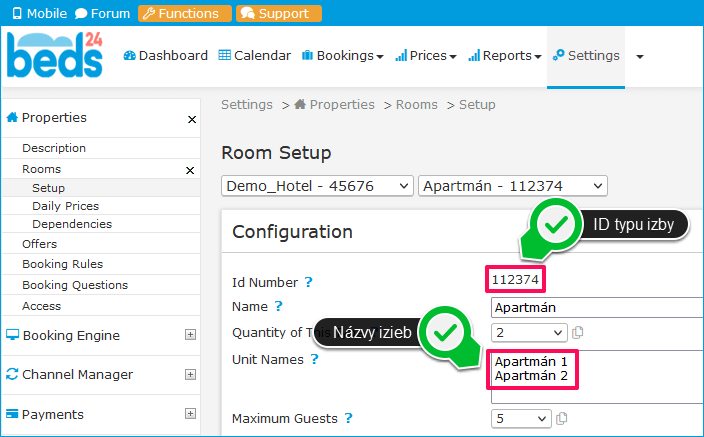 Obrázok č. 3: ID typu izby v Beds24 a názvy individuálnych izieb