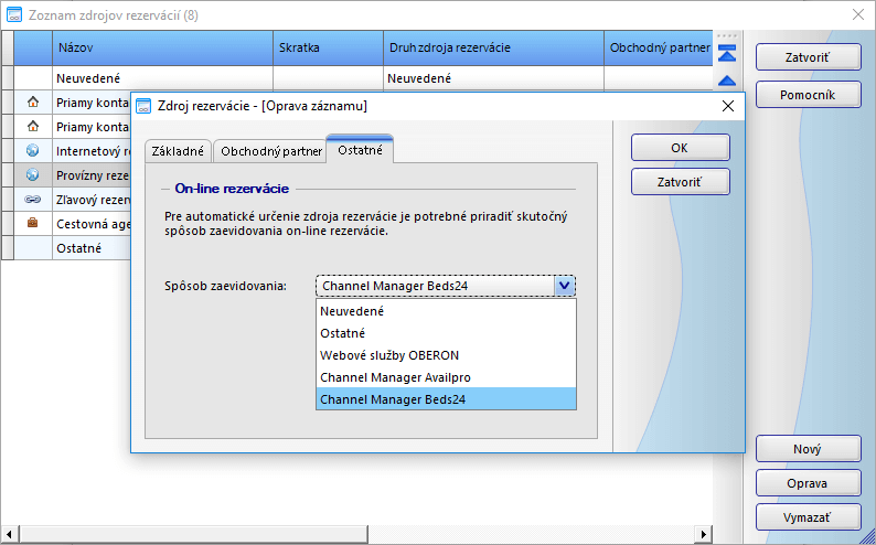 - V záložke Ostatné zvoľte spôsob zaevidovania na Channel Manager Beds24.
