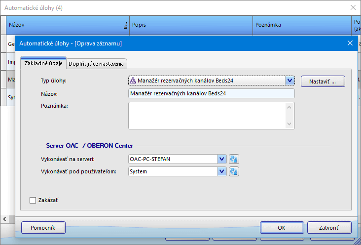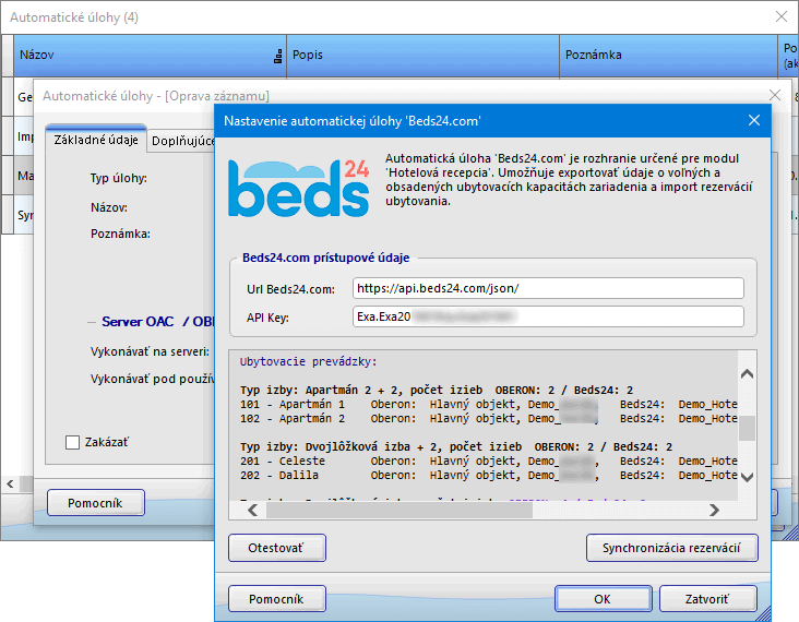 Systém OBERON komunikuje s manažérom rezervačných kanálov Beds24 na základe automatickej úlohy nastavenej v programe OBERON - Agenda firmy, ponuka Servis, Automatické úlohy (Manažér rezervačných kanálov Beds24).