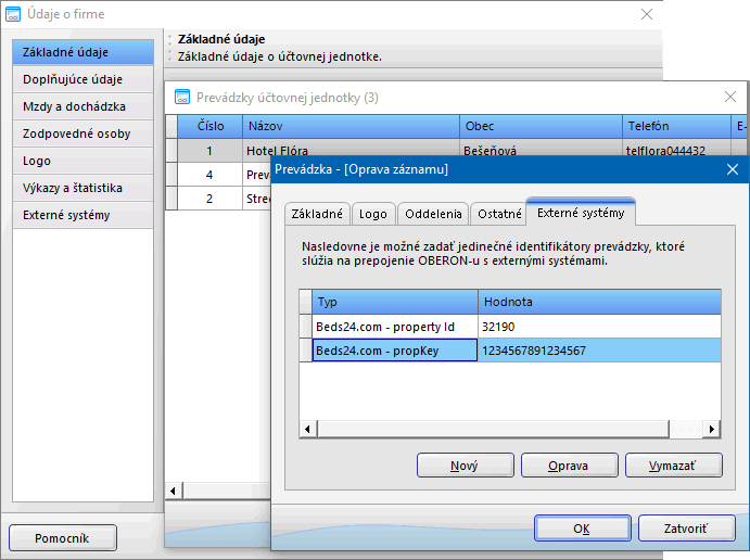 Obrázok č. 2: Zadanie ID hotela a propKey v OBERON-e (ponuka Firma, Údaje o firme, Základné údaje, Prevádzka)