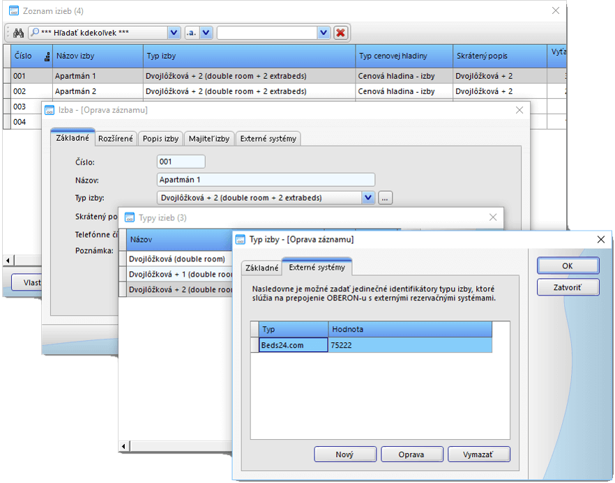 - Otvorí sa formulár Typ izby, kde v záložke Externé systémy zadajte jedinečný identifikátor typu izby pre Beds24. Ide o ID typu izby, ktoré získate vo svojom účte v Beds24 v ponuke Settings/Properties/Rooms. Samozrejme, predtým je potrebné typy izieb v Beds24 nadefinovať. Je pritom potrebné pamätať na to, že Rooms môžu znamenať Izby (ak existuje len jedna izba daného typu), aj Typy izieb (ak existuje viac izieb daného typu). V prípade, že existuje viac izieb daného typu, individuálne izby sa zadávajú do poľa Unit Names do stĺpca pod seba (oddelené tlačidlom Enter). Jednotlivými izbám v OBERON-e sa odporúča priradiť konkrétne názvy (napr. Aneta, Barbora a pod., resp. Apartmán 1, Apartmán 2 atď. alebo iné jednoznačné názvy) a tie isté názvy je potom nutné použiť aj v Beds24, aby bolo možné názvy izieb jednoznačne identifikovať, a tak po nastavení komunikácie medzi OBERON-om a Beds24 verifikovať správnosť synchronizácie rezervácií, resp. ubytovaní.