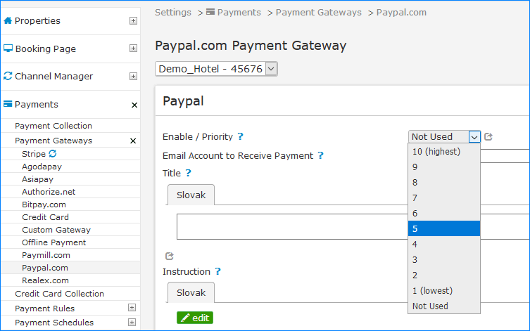 Poznámka: Ak budete používať viac ako jednu platobnú bránu (napr. PayPal a zároveň Paymill), číslo určí poradie, v ktorom sa na stránke rezervácie zobrazí možnosť platby prostredníctvom danej platobnej brány. Ak budete používať len jednu platobnú bránu, je možné na aktiváciu použiť ľubovoľné číslo.