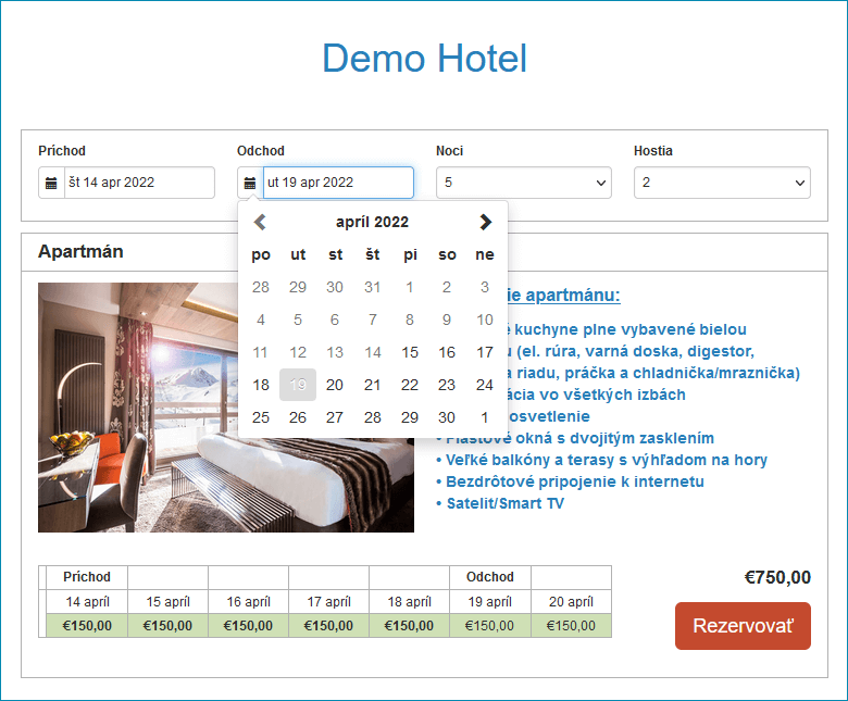 - Podľa cien nastavených v manažéri rezervačných kanálov sa v rezervačnom formulári zobrazuje automaticky vypočítaná cena za ubytovanie v závislosti od počtu nocí pobytu a počtu izieb.